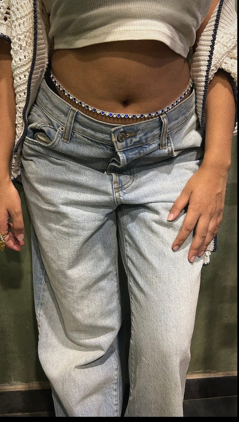 The waist chain is 27inches long with an extension so it would fit waist size 27 and above. It includes 100 pieces of kundan in blue and white.