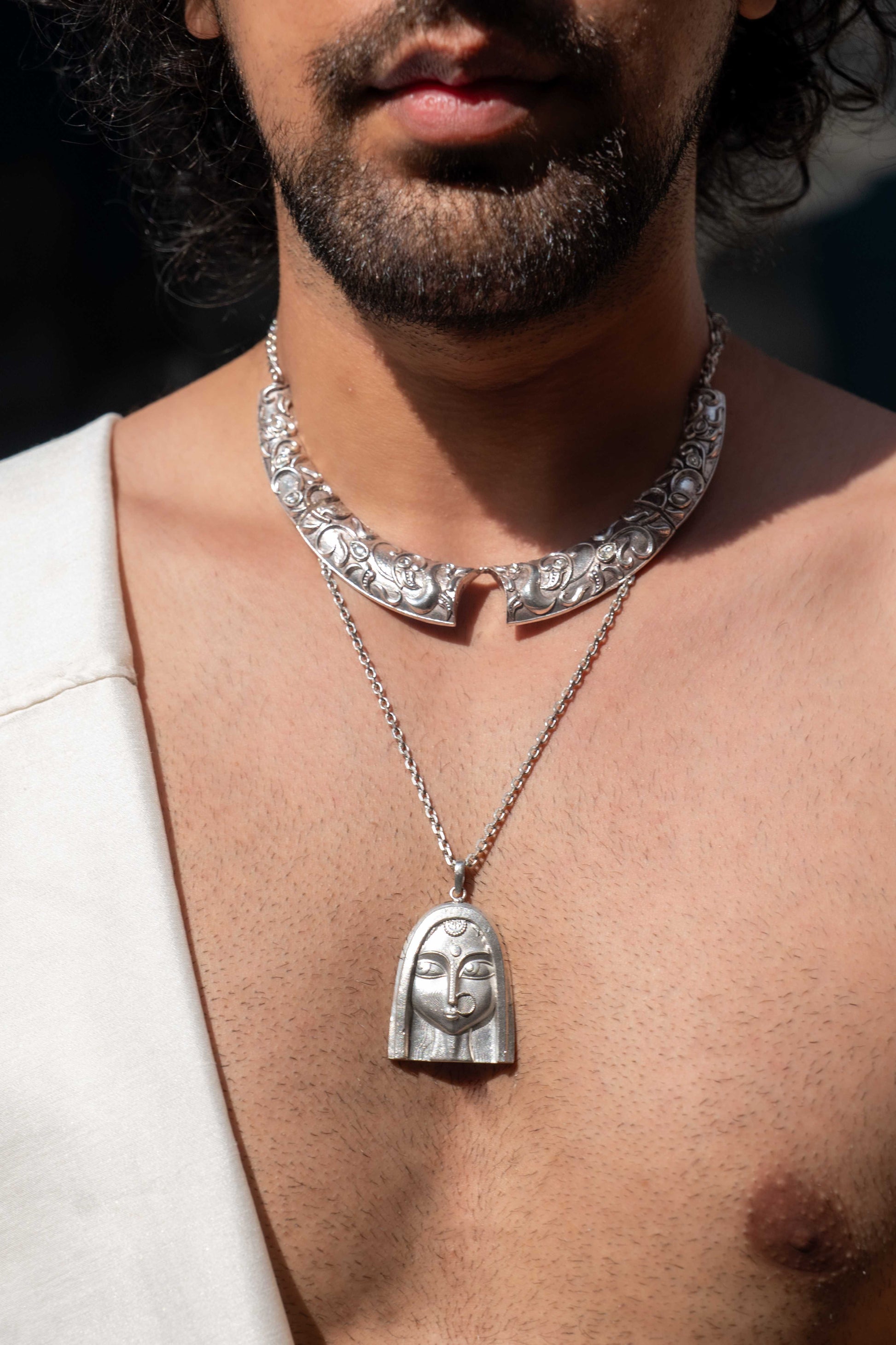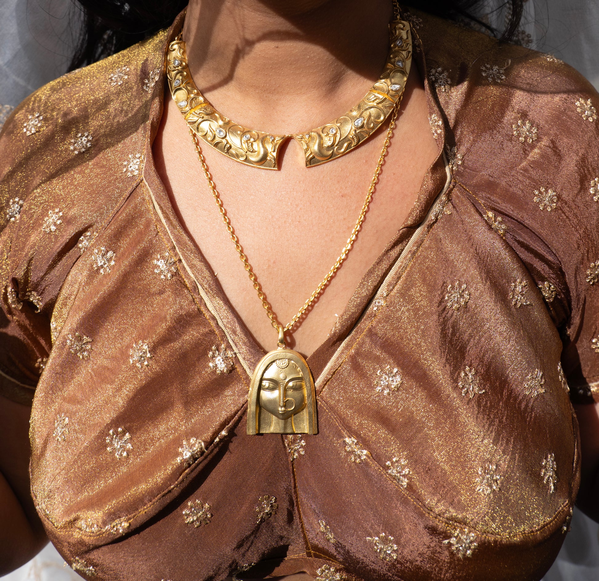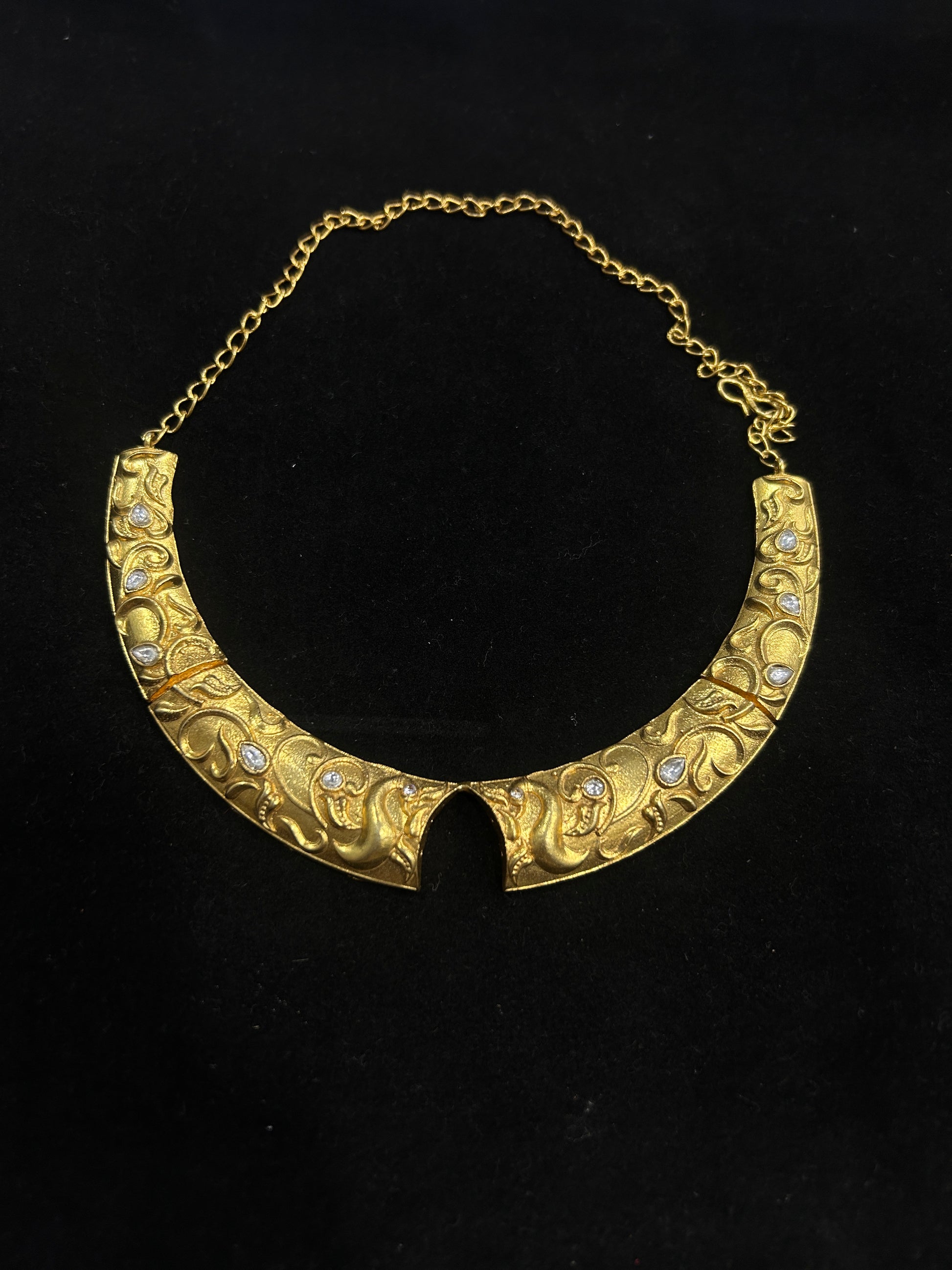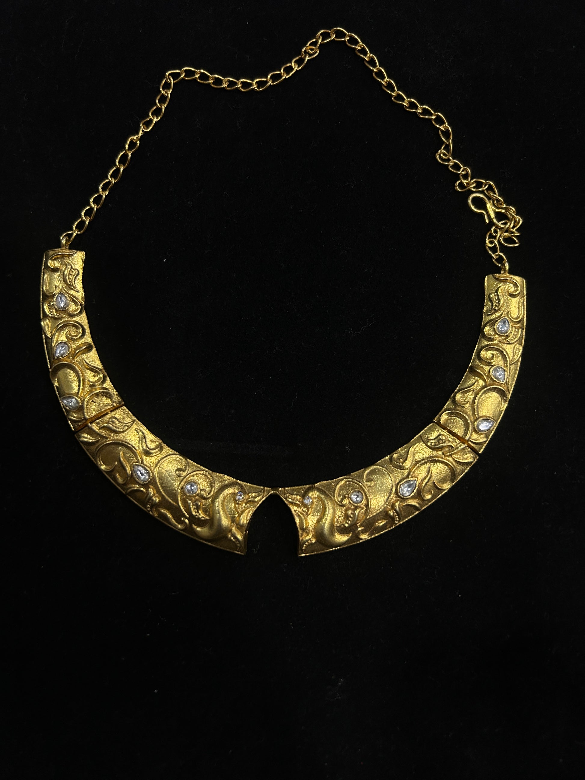 The Prakritika hasli is a captivating and spiritually rich piece of jewelry, designed to embody the beauty of nature, divine grace, and the elegance of traditional Indian craftsmanship. The name Prakritika is derived from the Sanskrit word Prakriti, meaning "nature" or "the natural world," and it reflects the deep connection between the divine and the earth's lush, flourishing beauty.