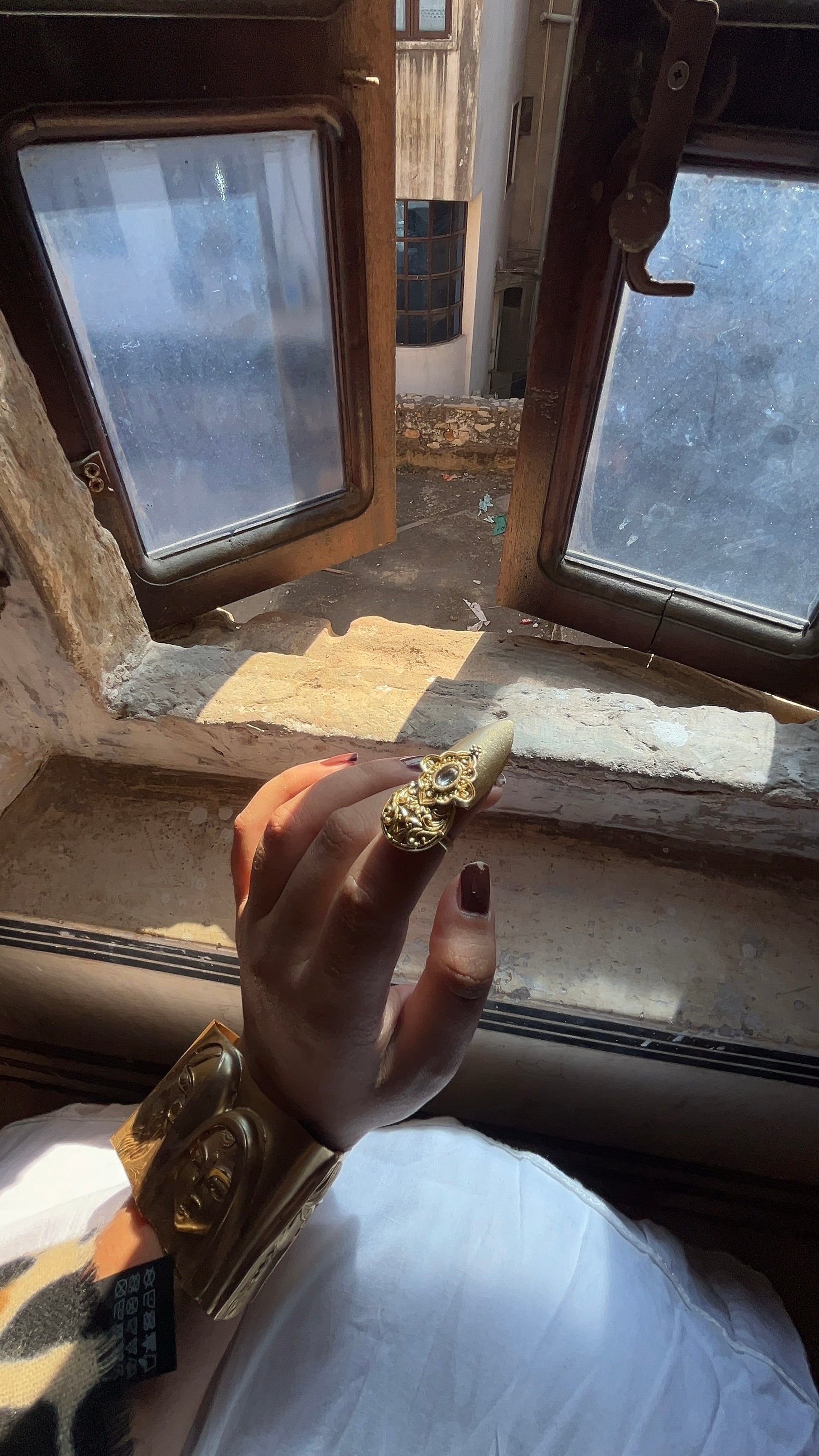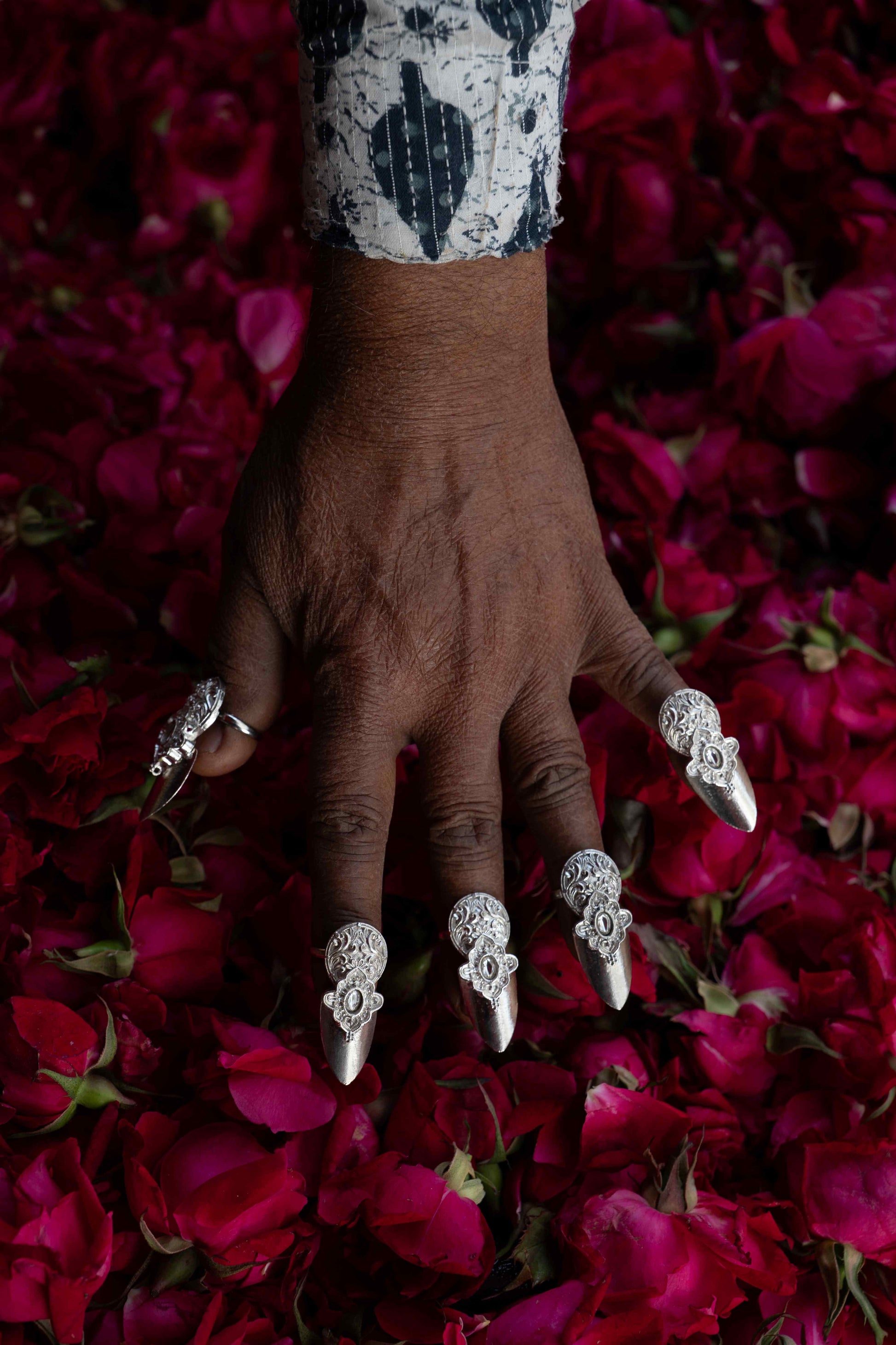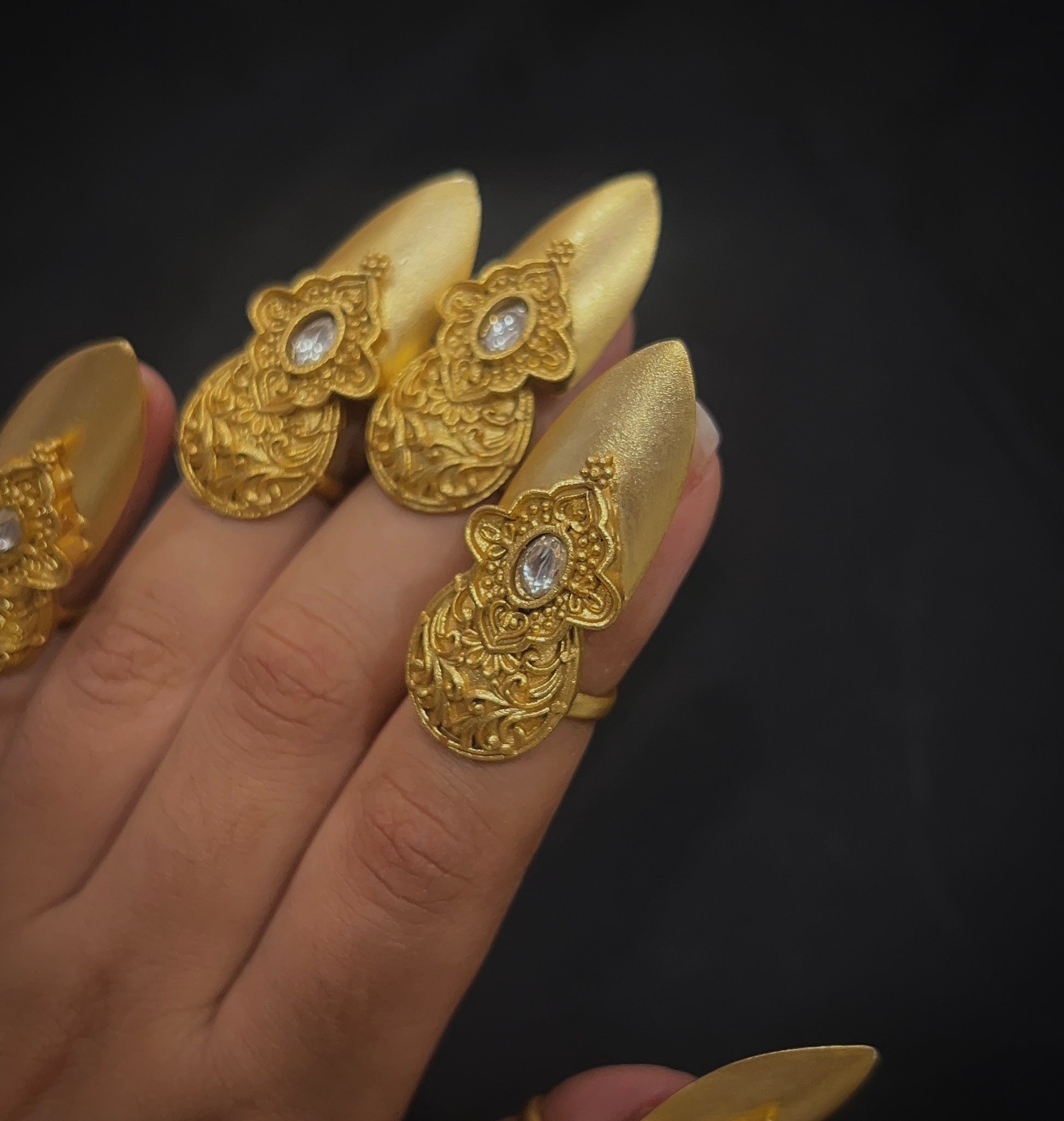 The Veerakriti nail ring is a bold and striking piece of jewelry that merges strength, spirituality, and nature. The name Veerakriti is derived from the Sanskrit words Veera (meaning "brave" or "warrior") and Kriti (meaning "form" or "creation"), symbolizing a creation of strength and courage. This nail ring is designed to embody power and resilience, reflecting the bold and unwavering energy of both divine protection and the untamed beauty of nature.